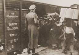 Gassing operations at Belzec began in mid-March 1942. Typically, trains of 40 to 60 freight cars arrived at the Belzec railway station. Between 80 and 100 people were crowded into each car. Twenty freight cars at a time were detached and brought from the station, along the small rail siding, into the camp. The arriving Jews were then ordered to disembark at the platform of the reception area. German SS and police personnel announced that the Jewish deportees had arrived at a transit camp and were to hand over all valuables in their possession. When the killing center first started operations, men were separated from women and children. As time went on, however, Jews arriving at Belzec came to suspect the terrible fate that awaited them. In the chaotic circumstances which ensued, camp officials could not always segregate them.