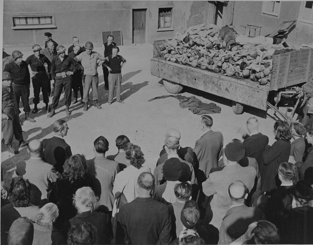 German civilians under US military escort are forced to view a wagon piled with corpses in the newly liberated Buchenwald concentration camp. Buchenwald, Germany, April 16, 1945.