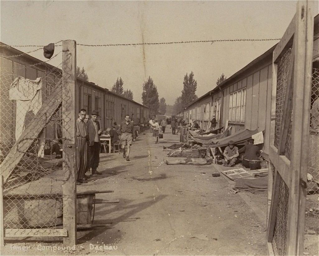 Survivors move around between rows of barracks in the newly liberated Dachau concentration camp. Dachau, Germany, May 1945.
